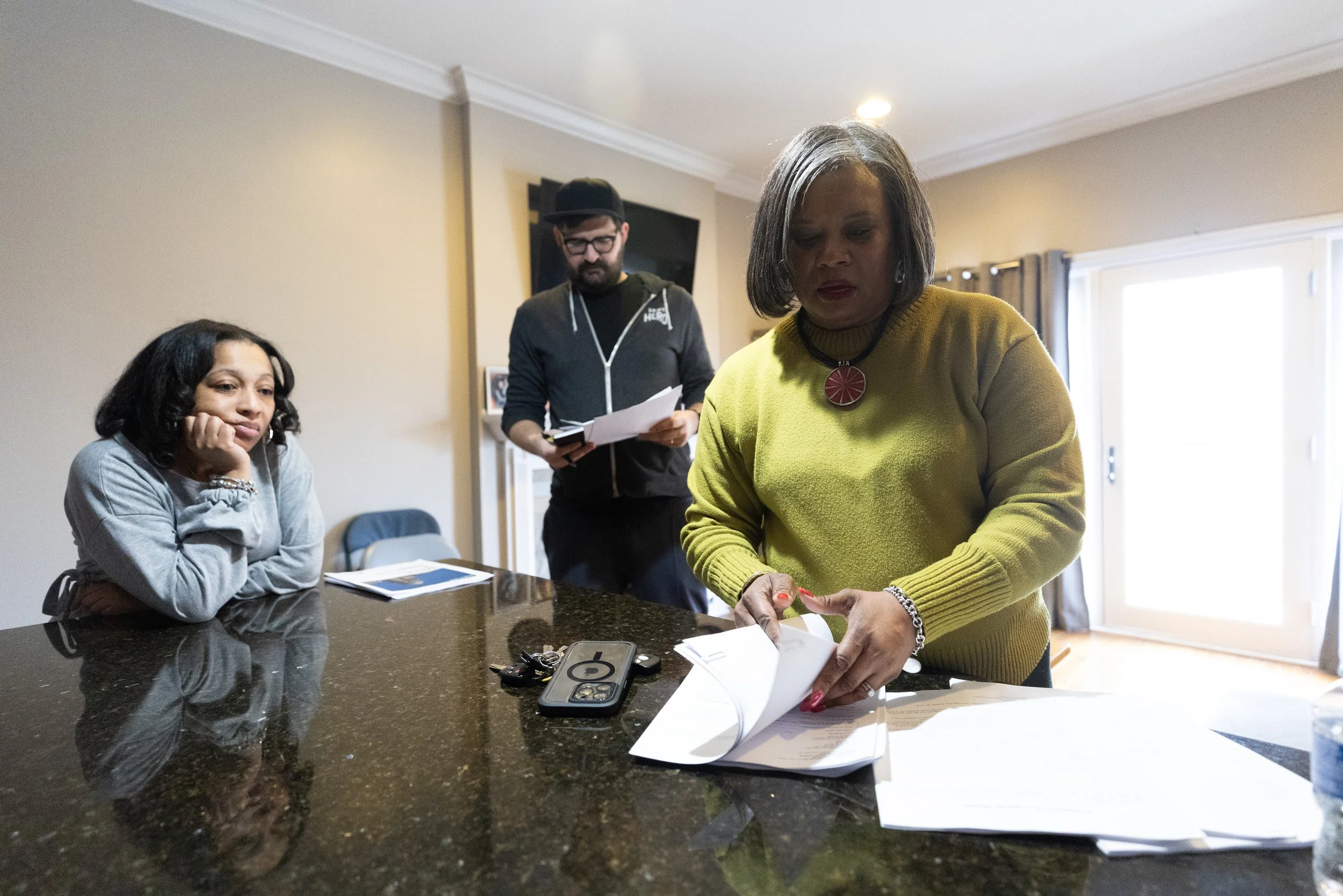 Mallori Lockett, a real estate agent in Bronzeville, passes out papers to condo owners Tanika McAfee, left, and Andy Mitchell-Gregory, center, in Chicago’s Bronzeville neighborhood on Saturday, Feb. 10, 2024. (Photo: Trent Sprague/for City Bureau)