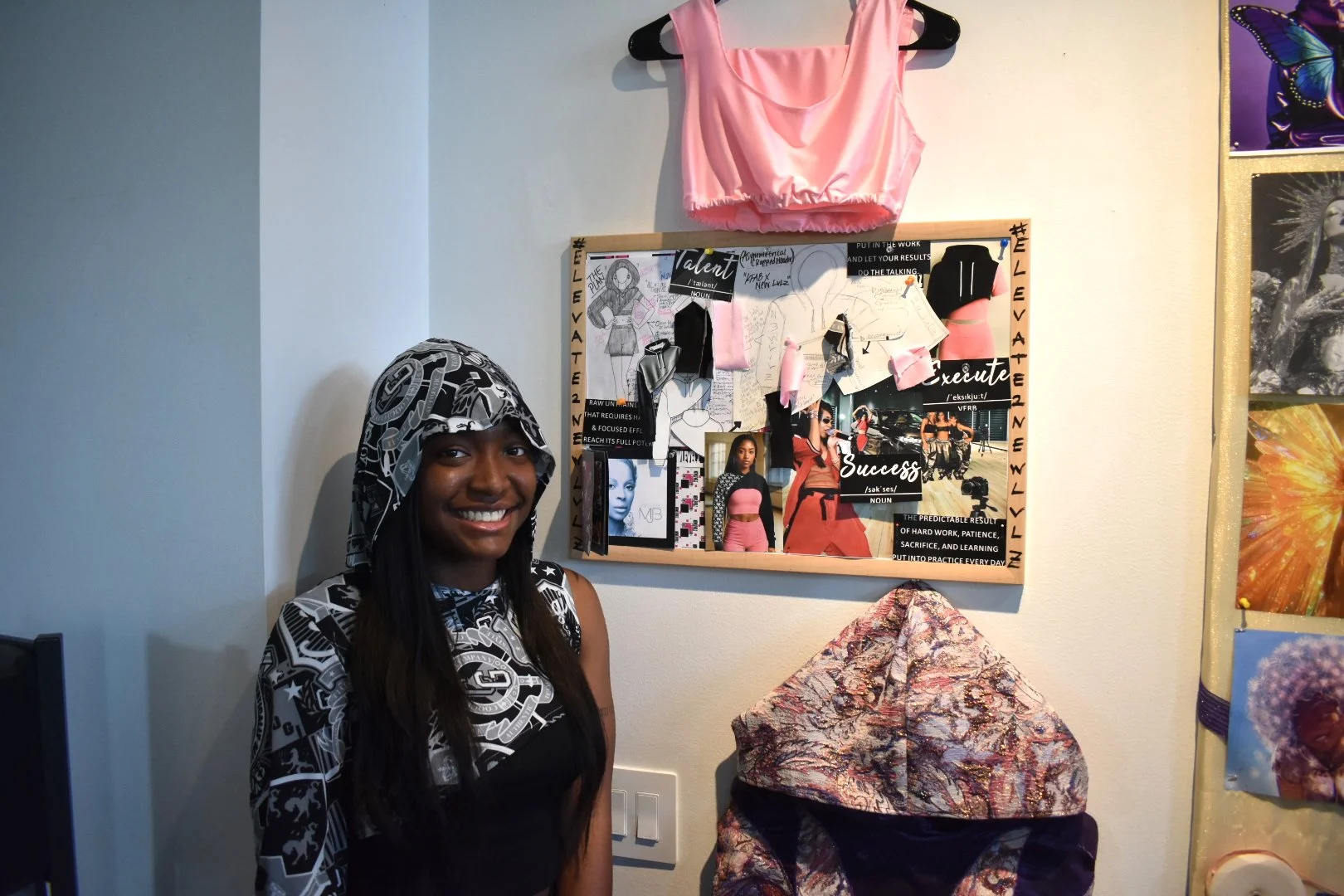 Kayla Perkins, 20, poses for a photo in front of samples and a vision board of her fashion line at a showcase Saturday, August 23rd, 2025. Perkins is part of a design program at Cre8 Space in South Shore, which trains young designers in fashion entrepreneurship and AI textile workforce development. (Kaelah Serrano/for City Bureau).