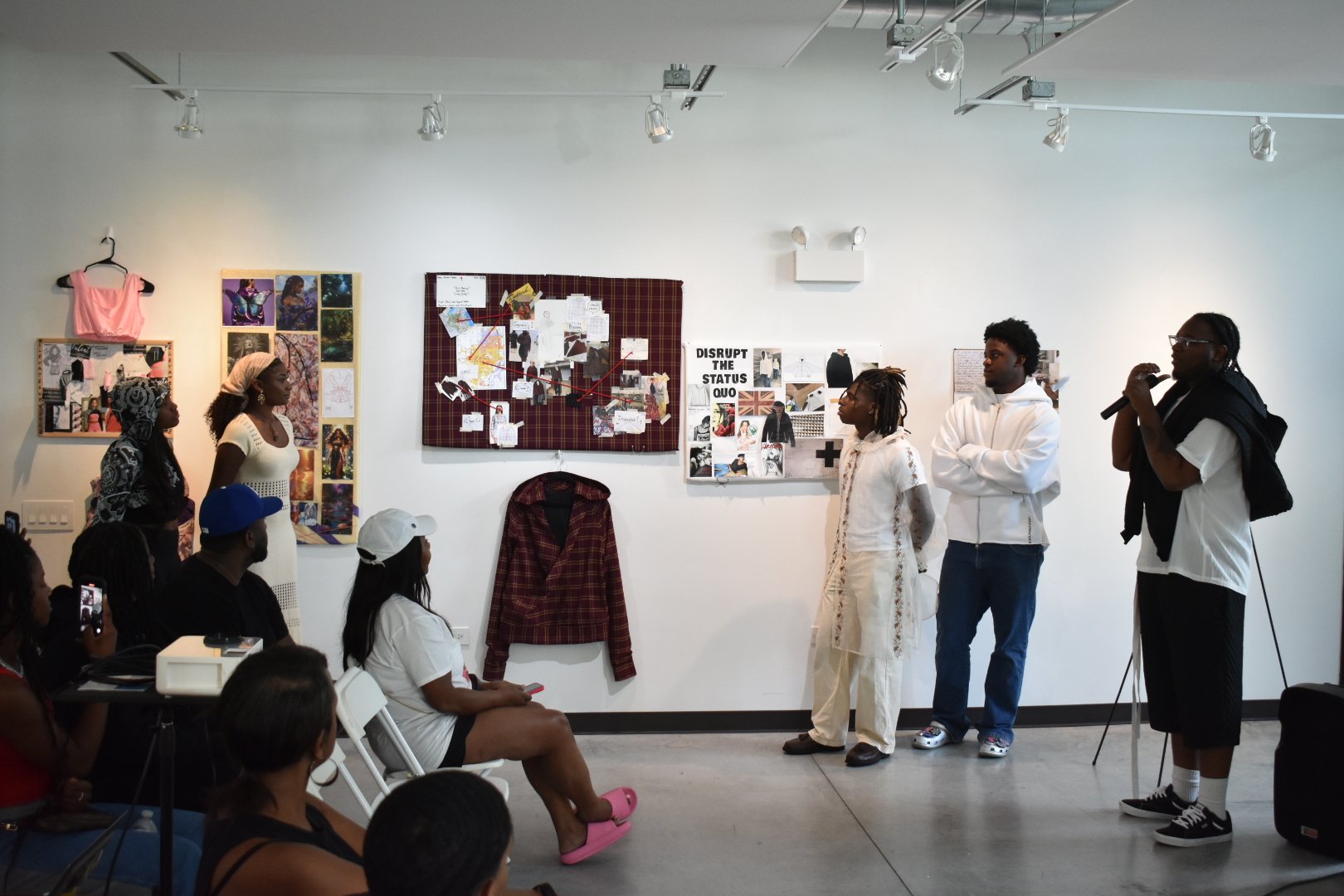 Kayla Perkins (far left, black-and-white hoodie) joins other young designers at Cre8 Space for a showcase of their designs and sketches on Saturday, August 23, 2025. (Kaelah Serrano/for City Bureau).