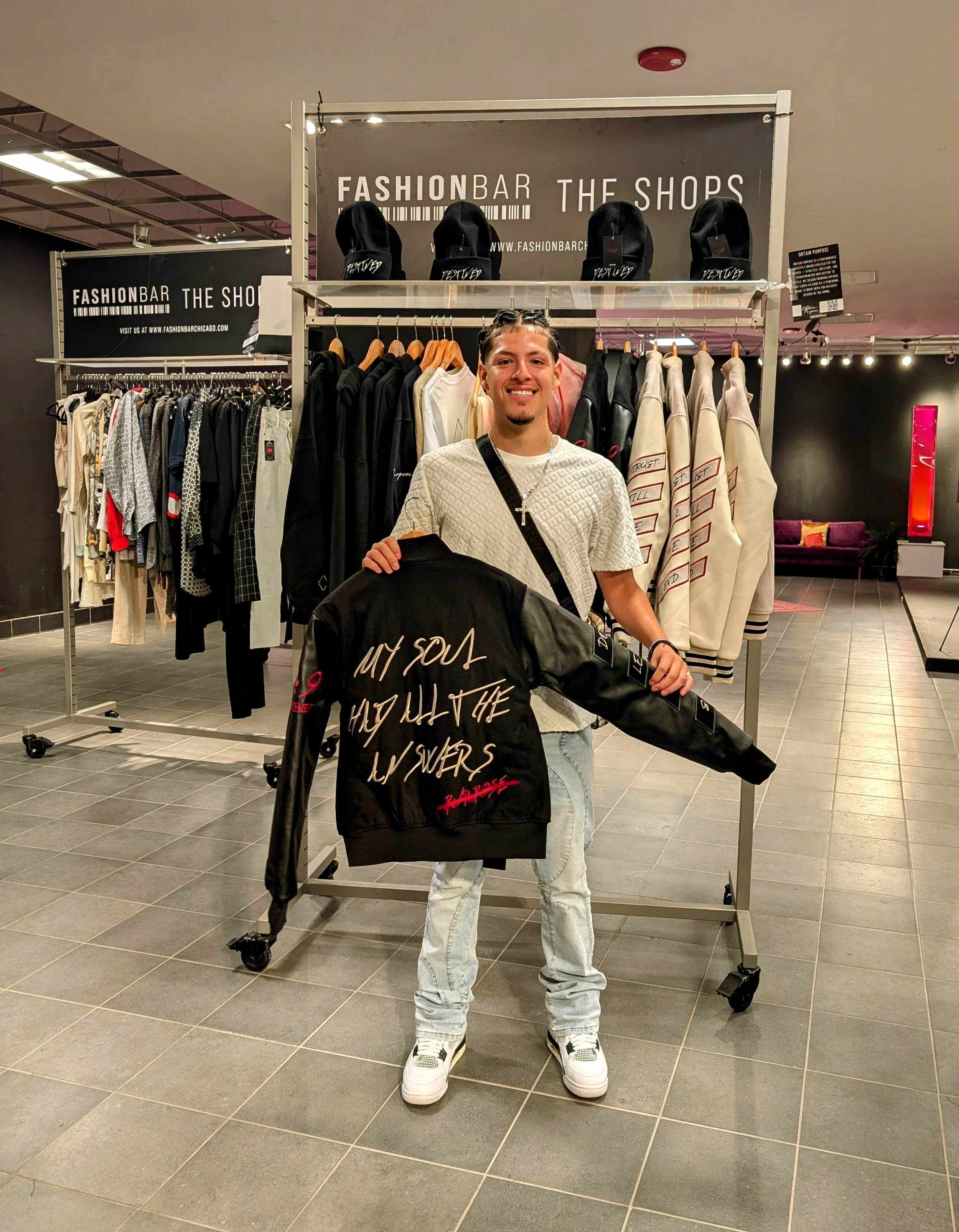 Joseph Duarte stands in front of items from his clothing brand, Obtain Purpose, at FashionBar Chicago on Thursday, July 10th, 2025. Duarte launched the collection with his brothers, and sells varsity jackets, t-shirts, and hoodies. (Robyn Meurkson/for City Bureau)