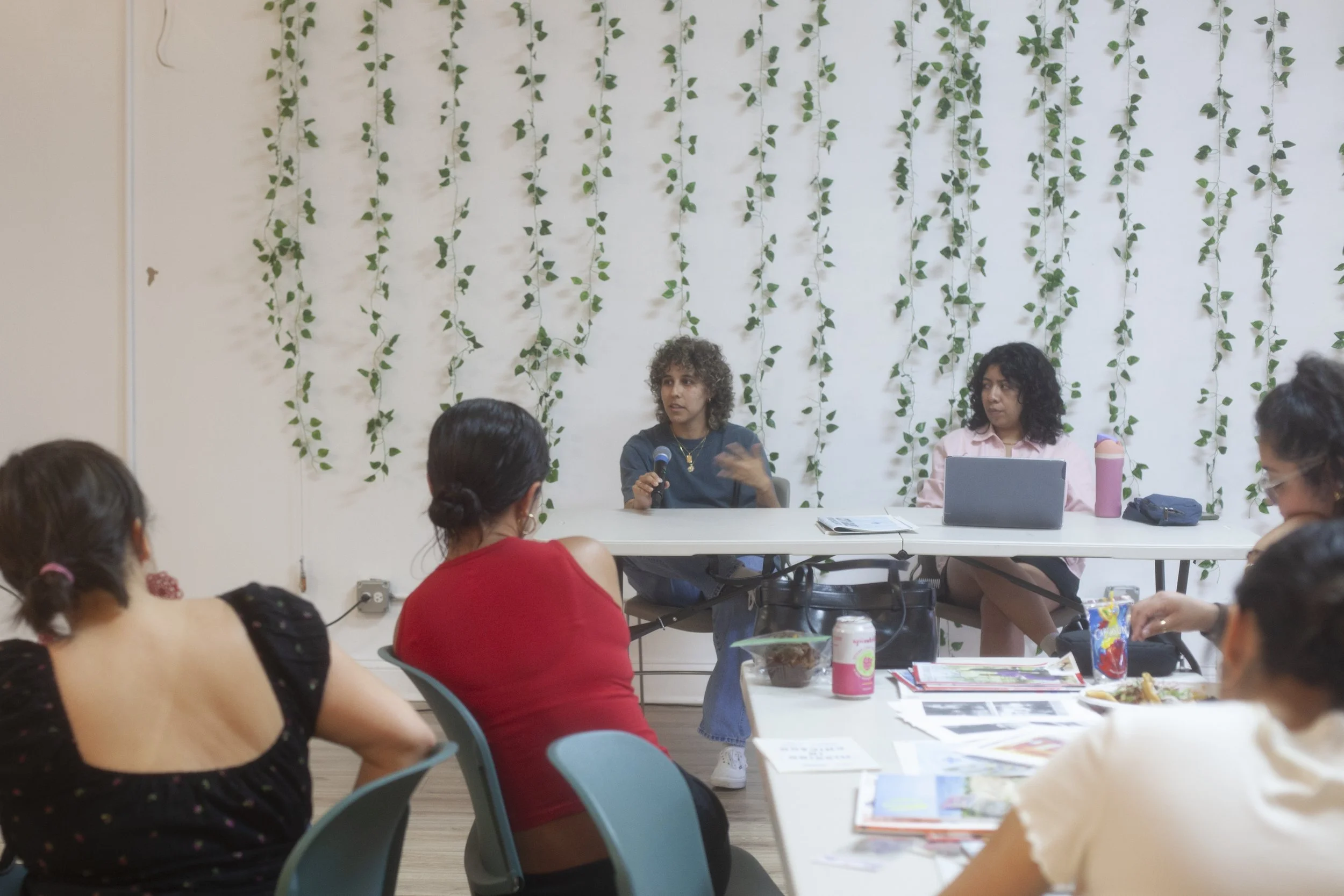 Thais (seated left), founder of Nuestro Chicago Archives, and Marilyn Carteno (seated right) of City Bureau host a panel discussion on the importance of visual archives, stories, and preservation in Latine communities, particularly those native to Chicago. (Photo: Samantha Friend Cabrera/City Bureau)