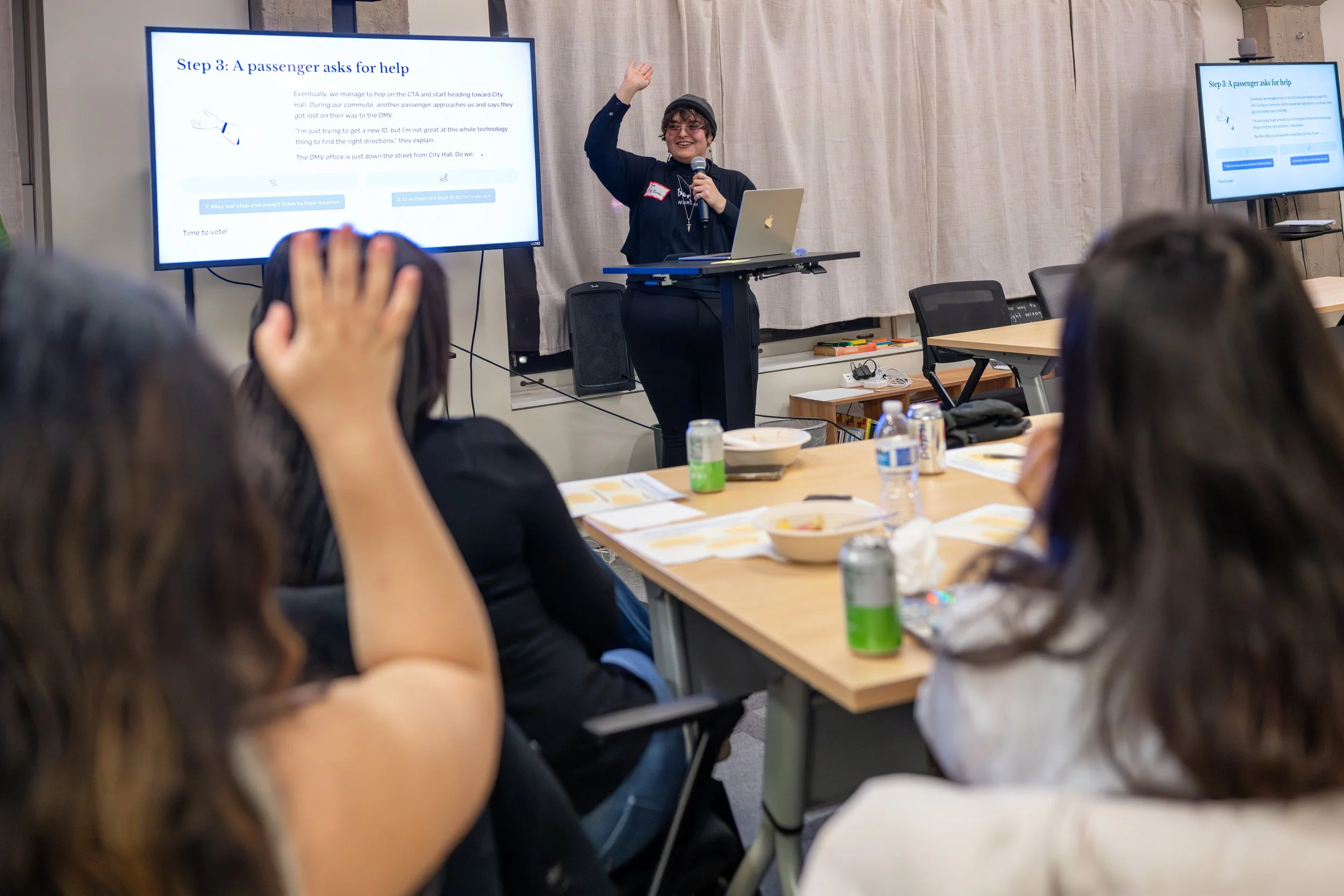 Tyra Bosnic, City Bureau’s senior manager of grants and public partnerships, asks for a show of hands during a discussion on digital equity during a Public Newsroom event at City Bureau’s Bronzeville office in Chicago on Dec. 10, 2025. (Dylan Connell/City Bureau)