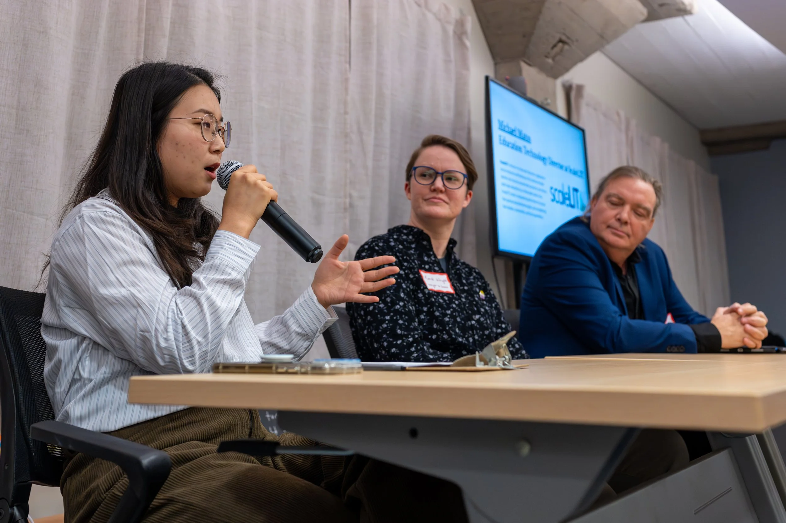 Melody Kim, civic engagement team lead for HANA Center, (left) discusses digital equity as a panelist along with Xandi Wright (center) and Michael Matos at City Bureau’s Public Newsroom event in its Bronzeville office in Chicago, Dec. 10, 2025. (Dylan Connell/City Bureau)