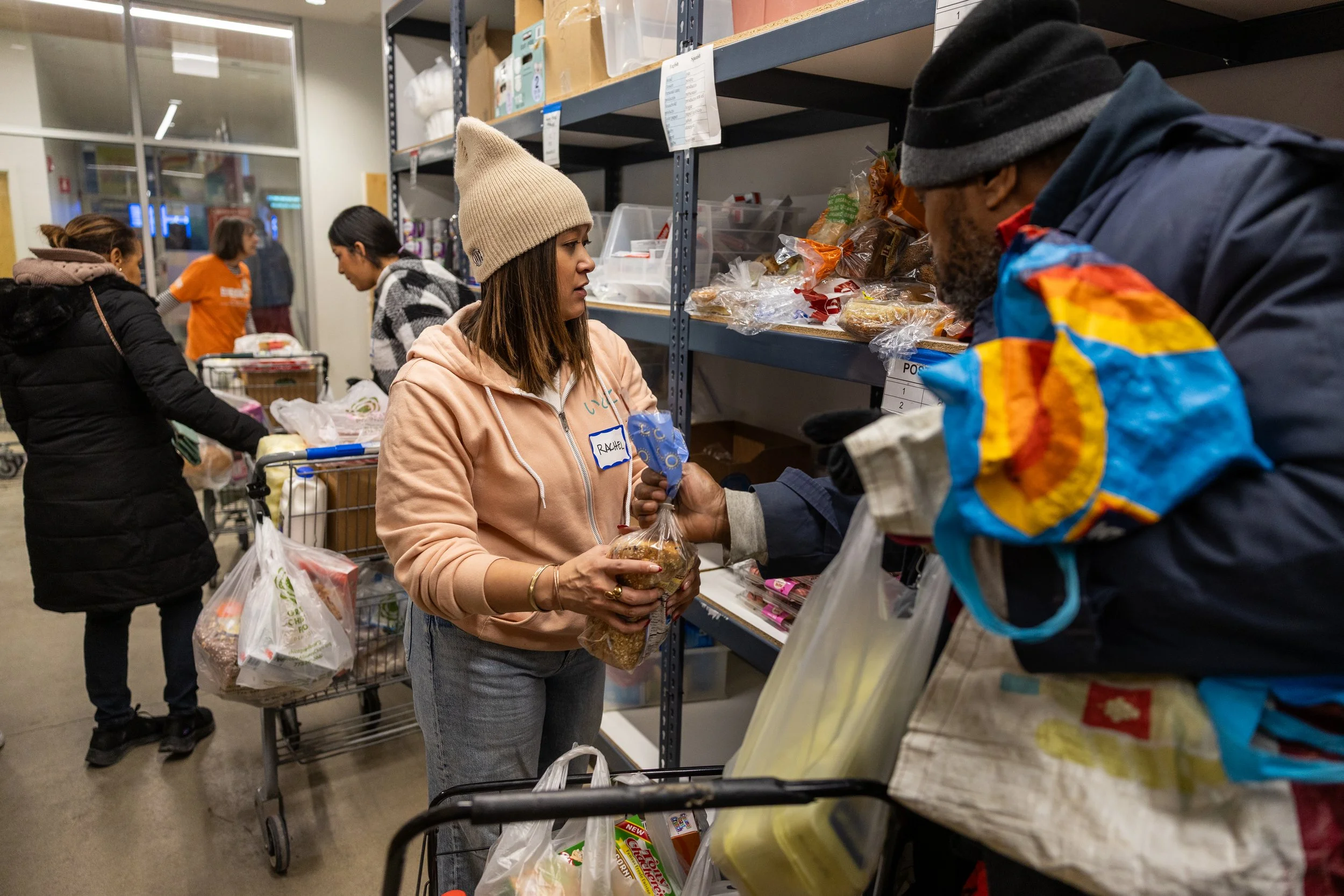 Volunteer Rachel Evaristo of Lakeview hands bread to a client at the El Mercadito food pantry in the Humboldt Park neighborhood on Feb. 2, 2026. (Heidi Zeiger / City Bureau)