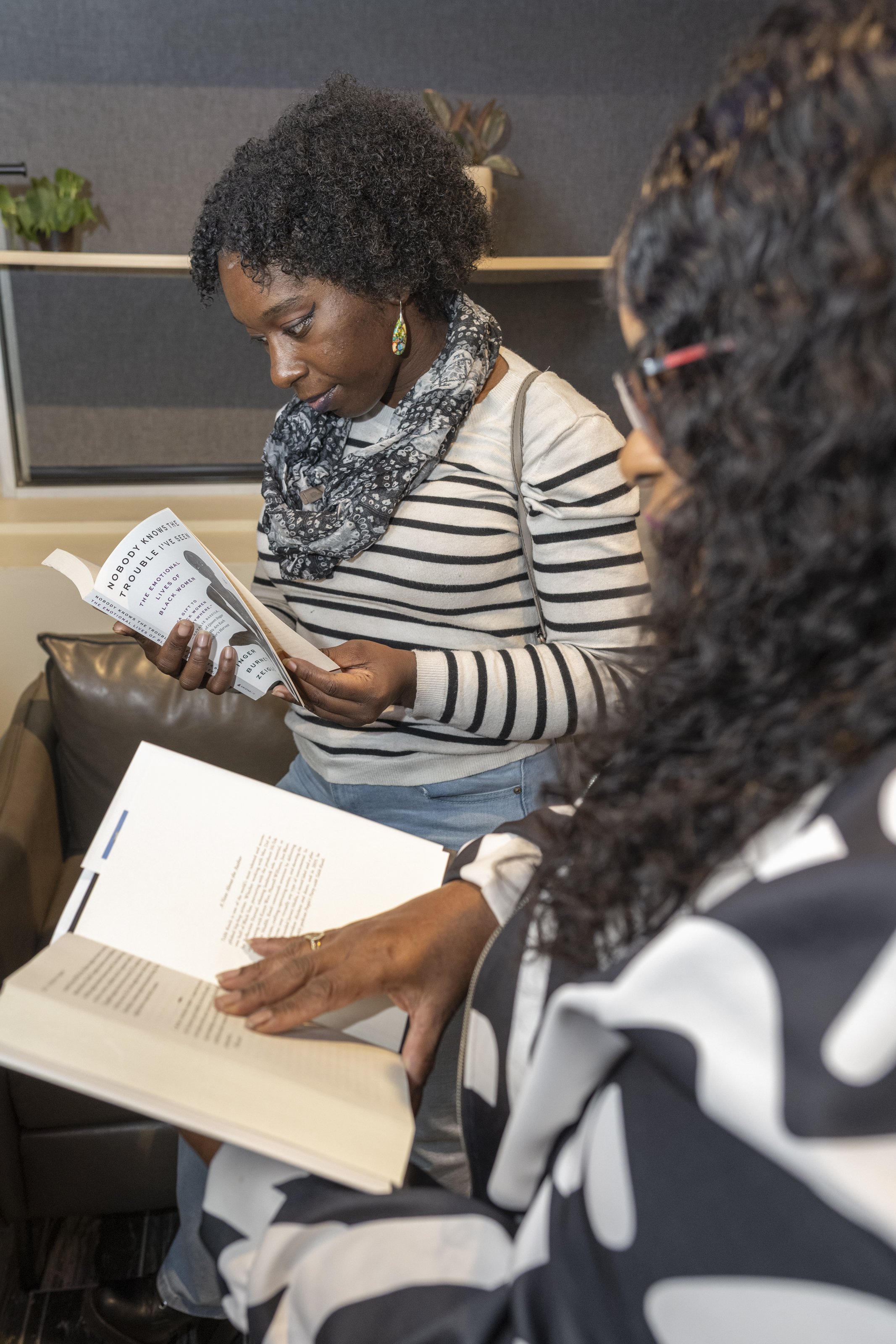 Attendees read books donated to the Banned Book Drive at the Jamii Arts Center in Chicago, Nov. 22, 2025. (Dylan Connell/City Bureau).