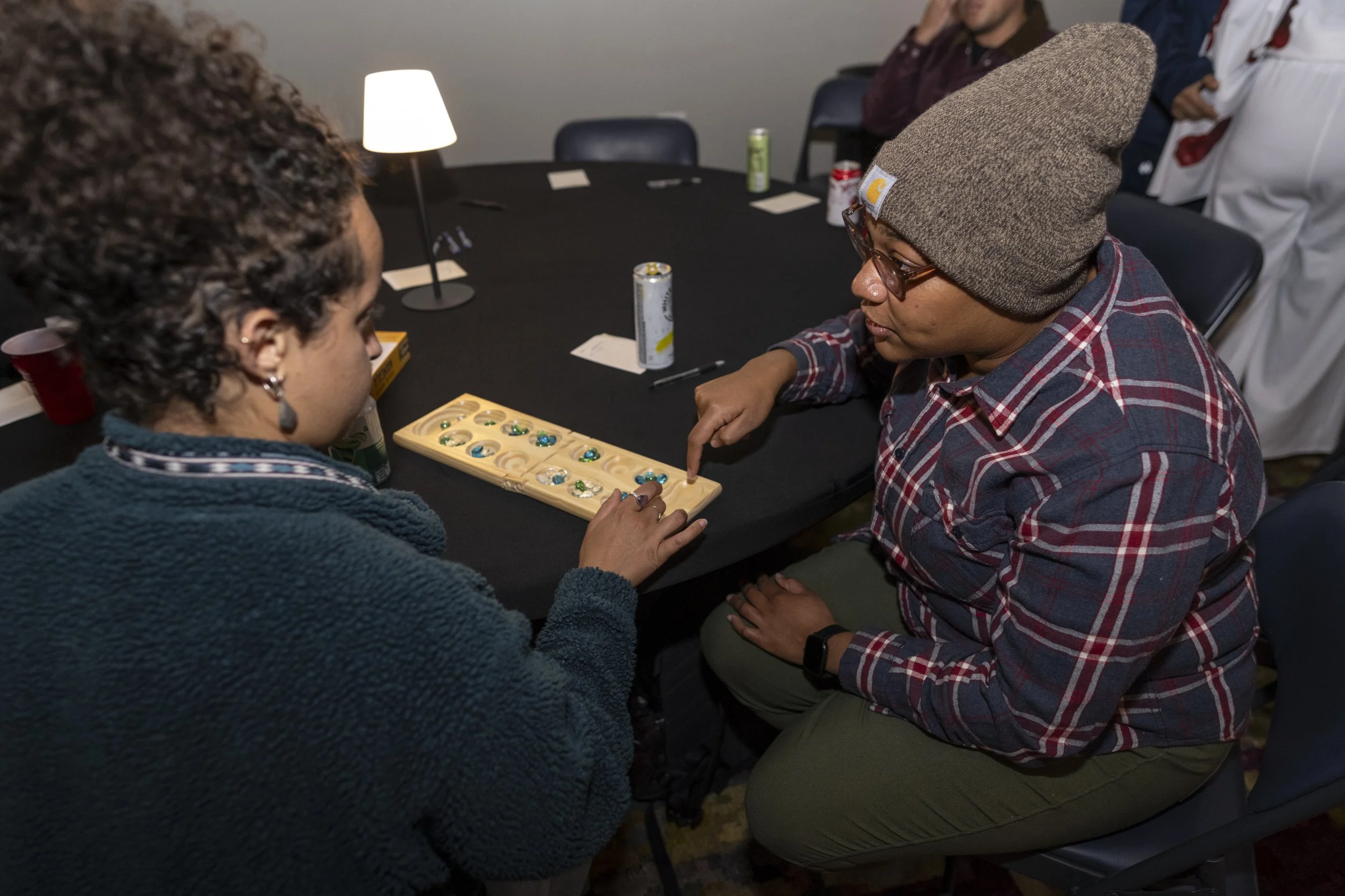 Two attendees play Mancala during the Banned Book Drive at the Jamii Arts Center in Chicago, Nov. 22, 2025. (Dylan Connell/City Bureau).