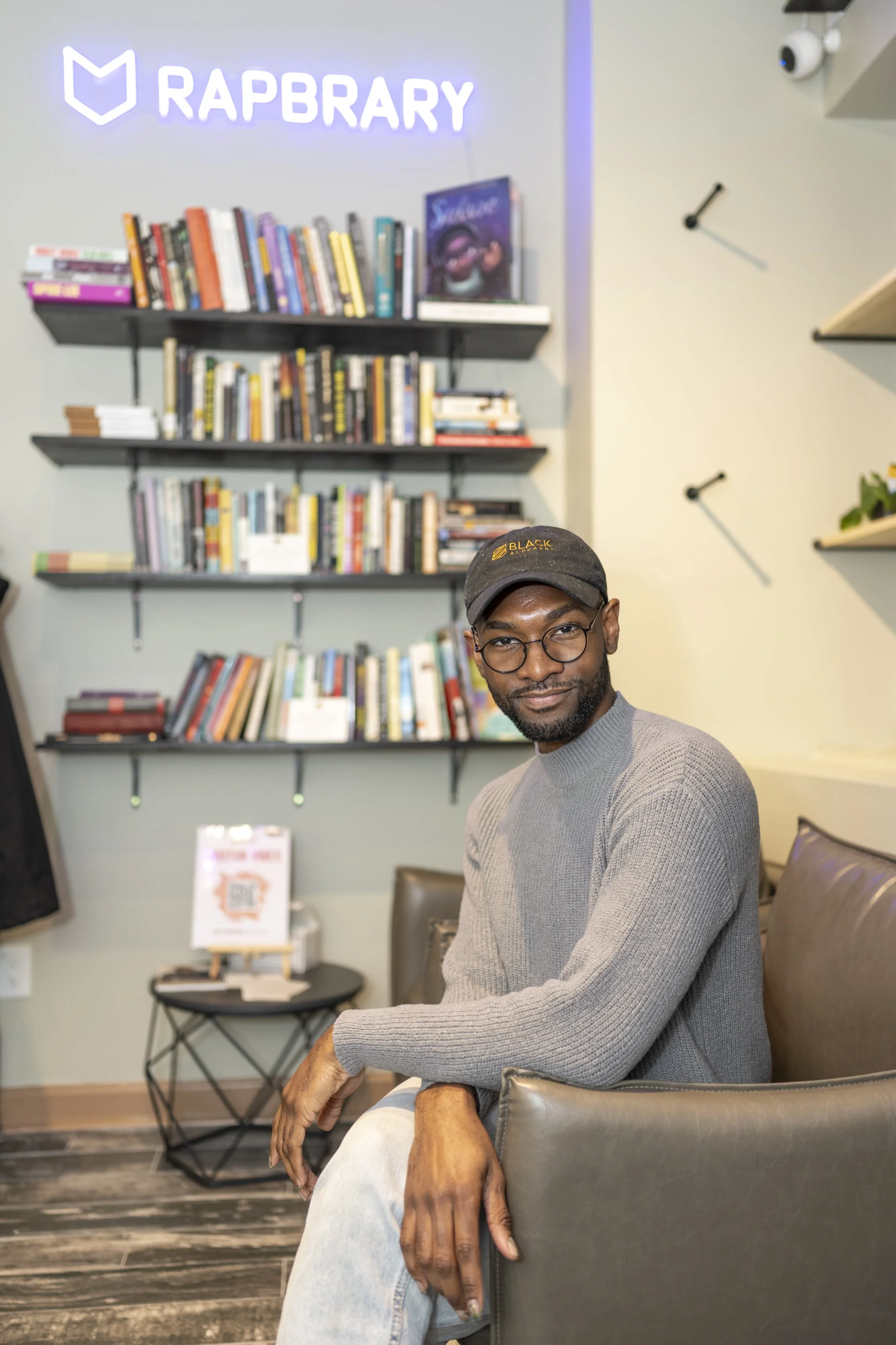 Joshua Miller sits inside the Jamii Arts Center during the Banned Book Drive in Chicago, Nov. 22, 2025. (Dylan Connell/City Bureau).