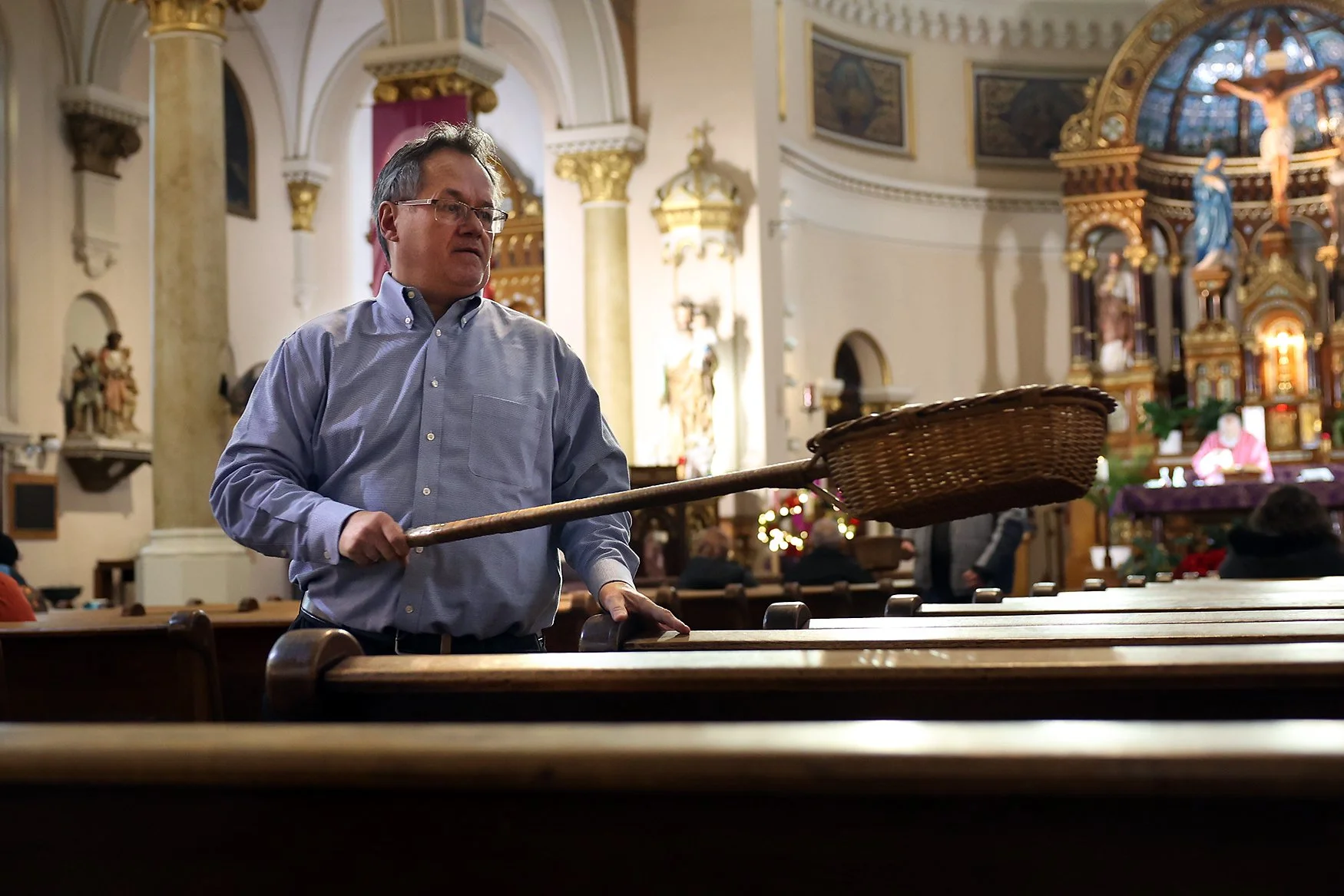 Mark Wojciechowski, head of the Polish ministry, collects donations during Mass on Sunday, Dec. 14, 2025, at St. Joseph Parish in the Back of the Yards. Wojciechowski has held a leadership position at the church for 30 years. (Anastasia Busby/City Bureau)
