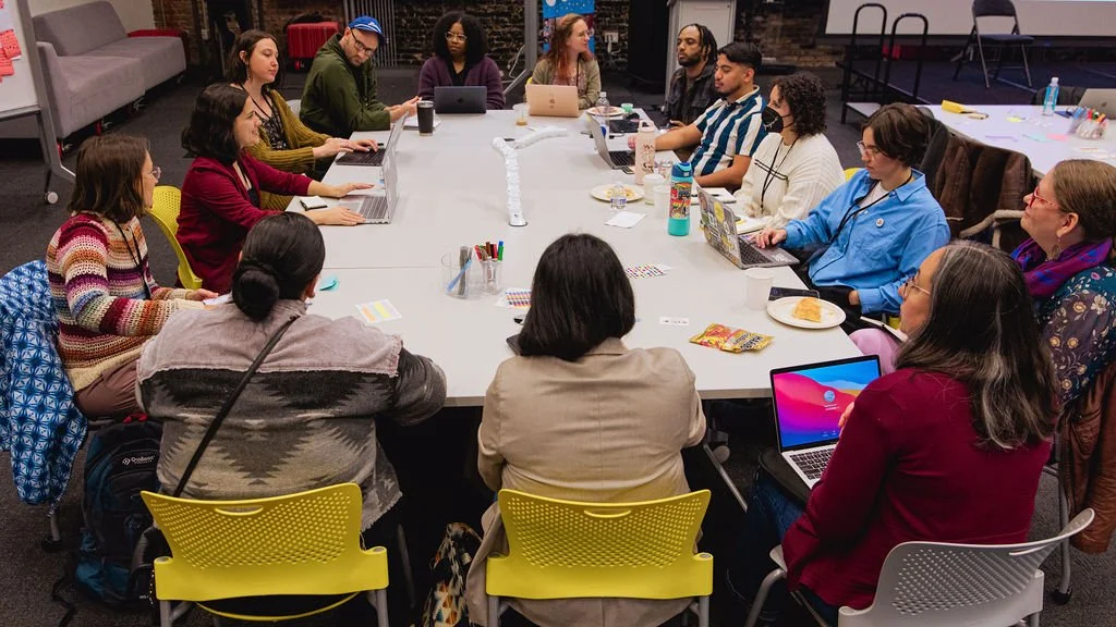 Attendees from multiple Documenters Network sites gather on the first day of City Bureau’s Docs Summit in Chicago’s Hyde Park neighborhood Tuesday, Oct. 21, 2025. (Michael Izquierdo/City Bureau)